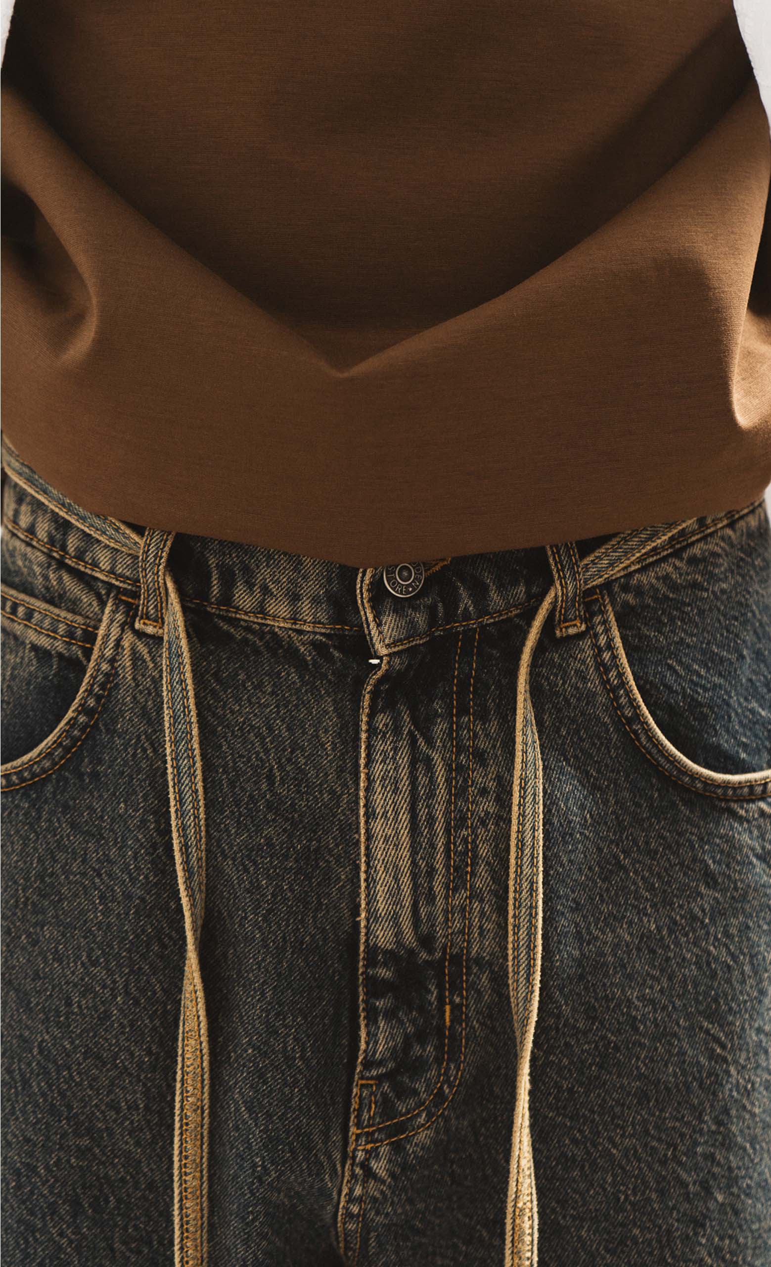 Cinque tasche. Cinturino in vita e chiusura frontale con cerniera e bottone.