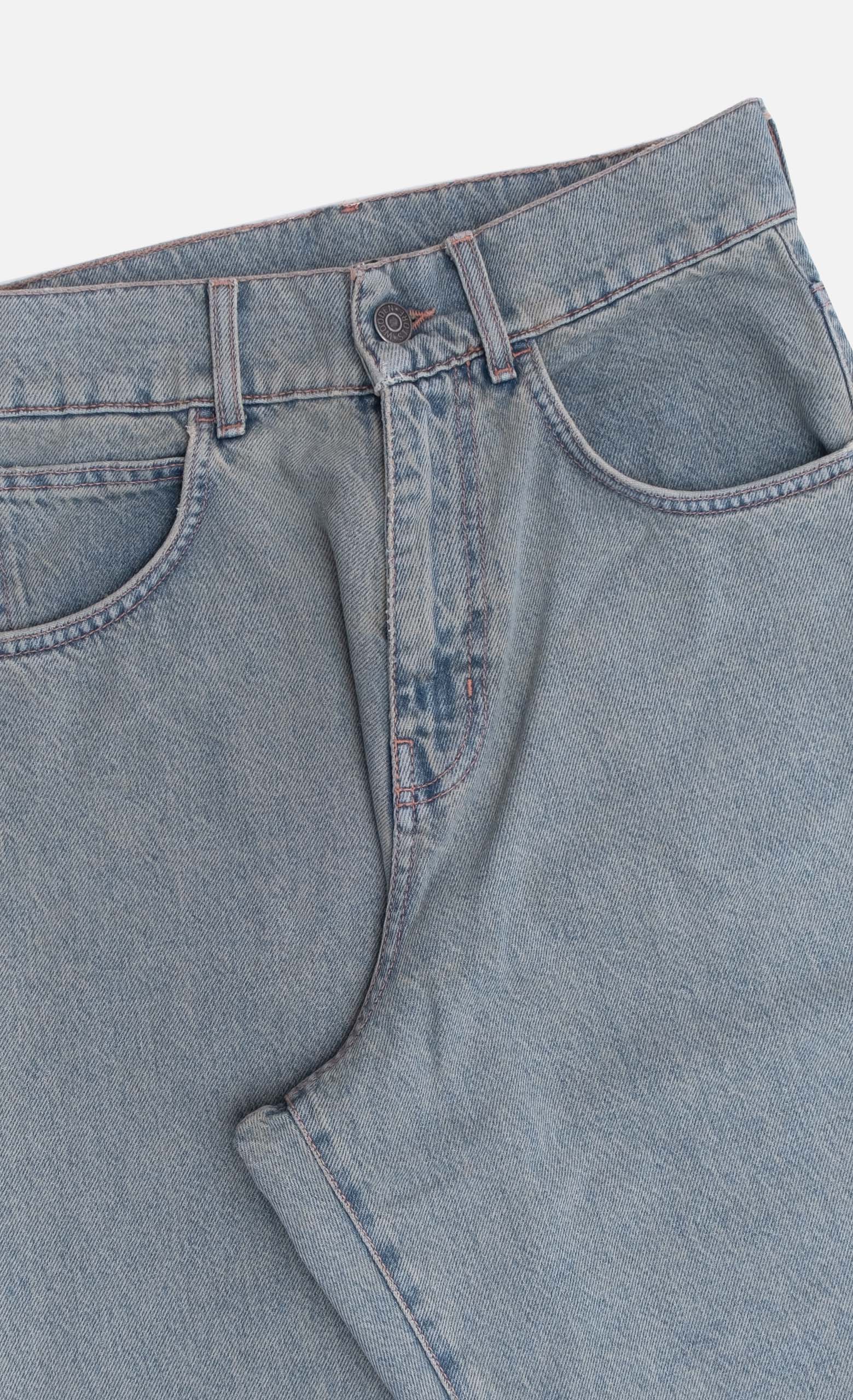 Cinque tasche. Effetto slavato. Chiusura frontale con cerniera e bottone.
