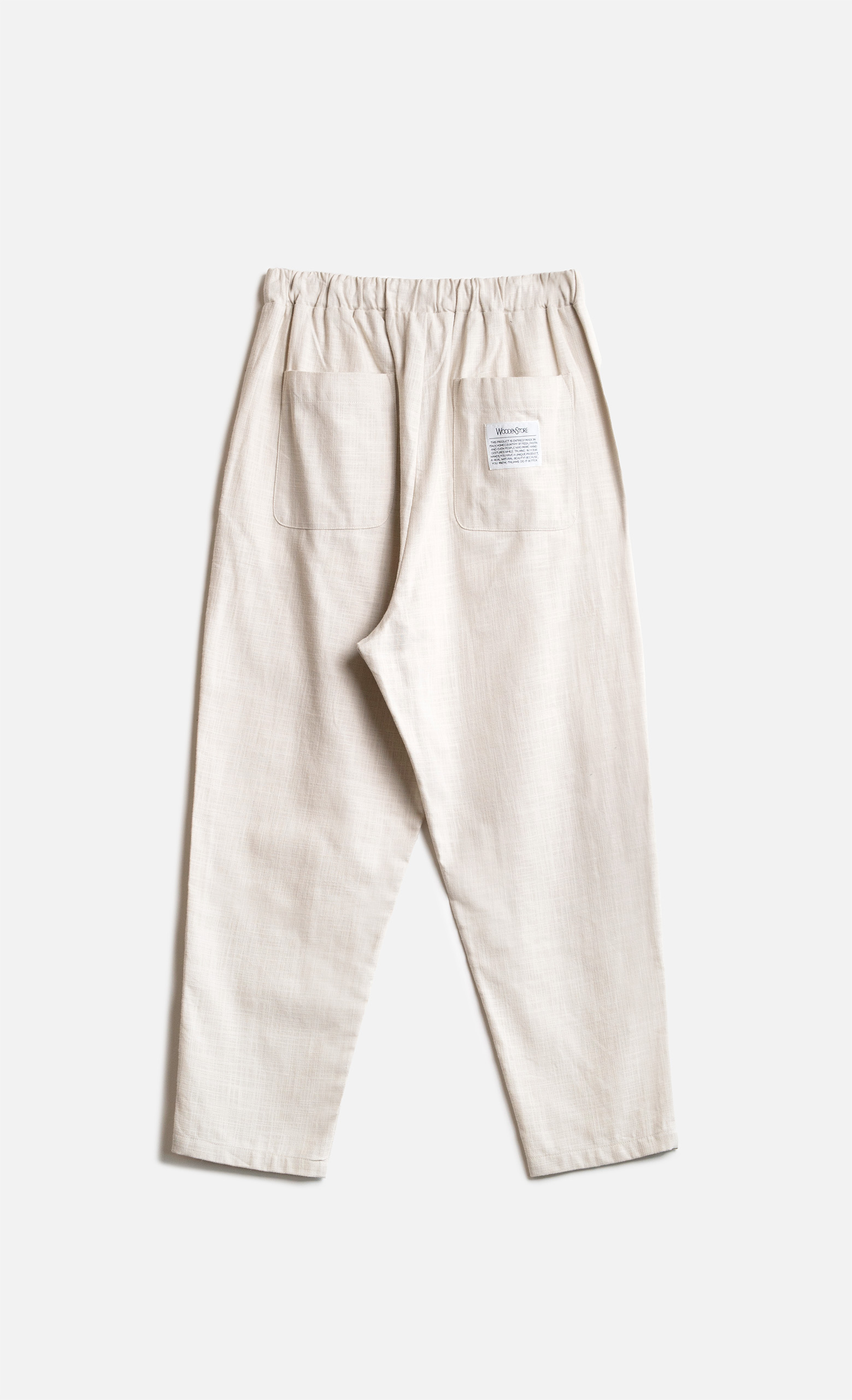 Tasche anteriori e dettaglio di tasca posteriore applicata con etichetta Wooden.