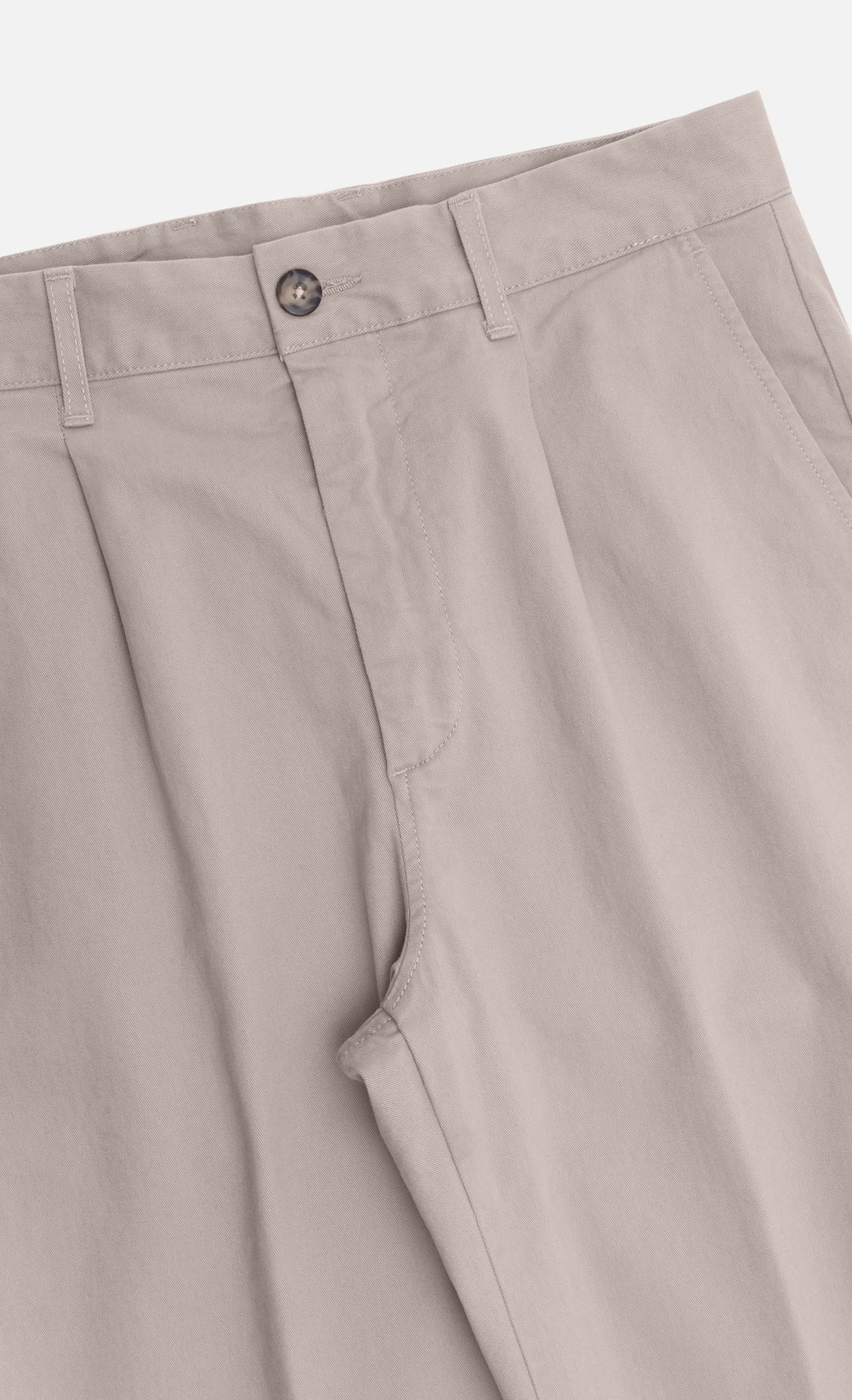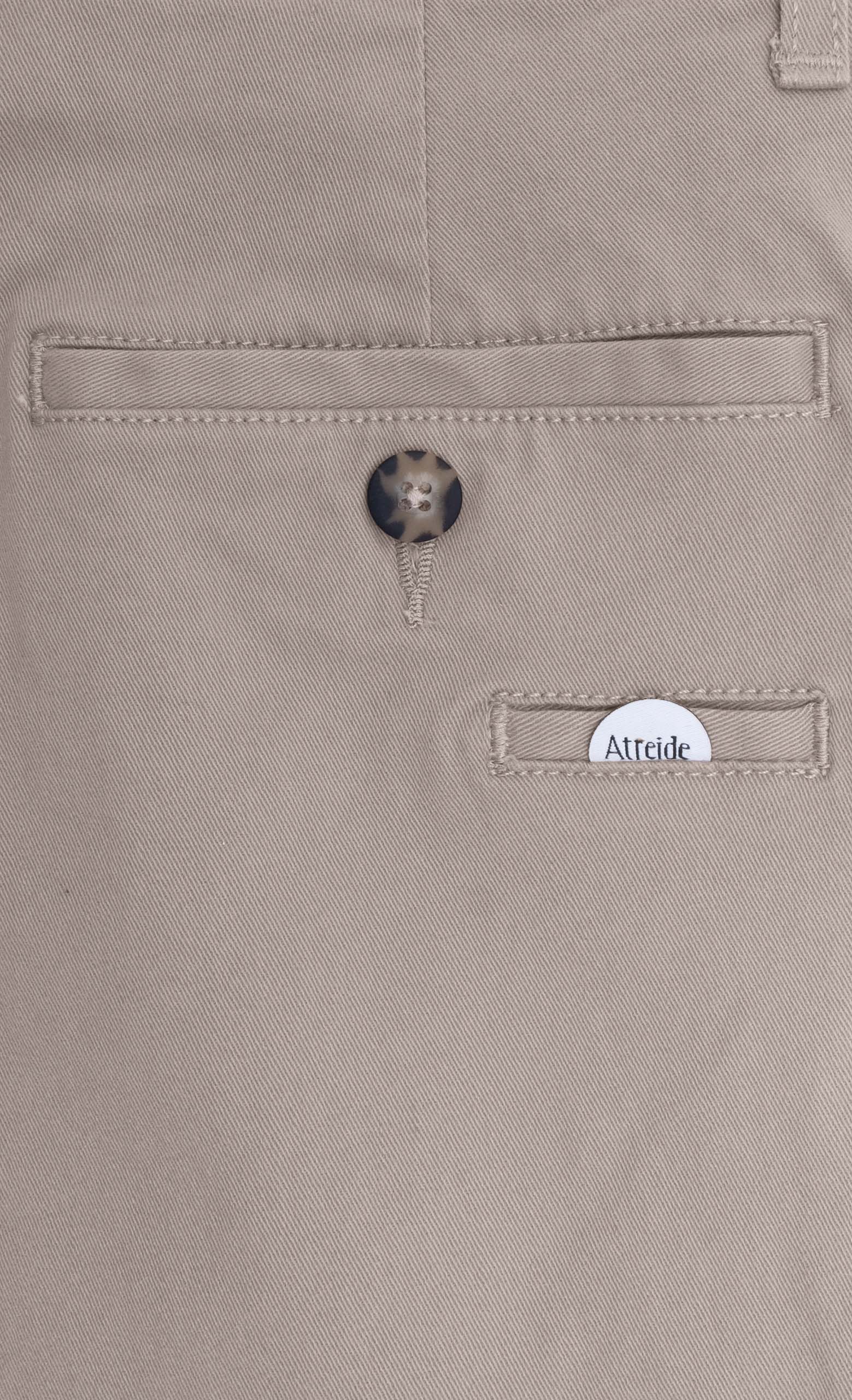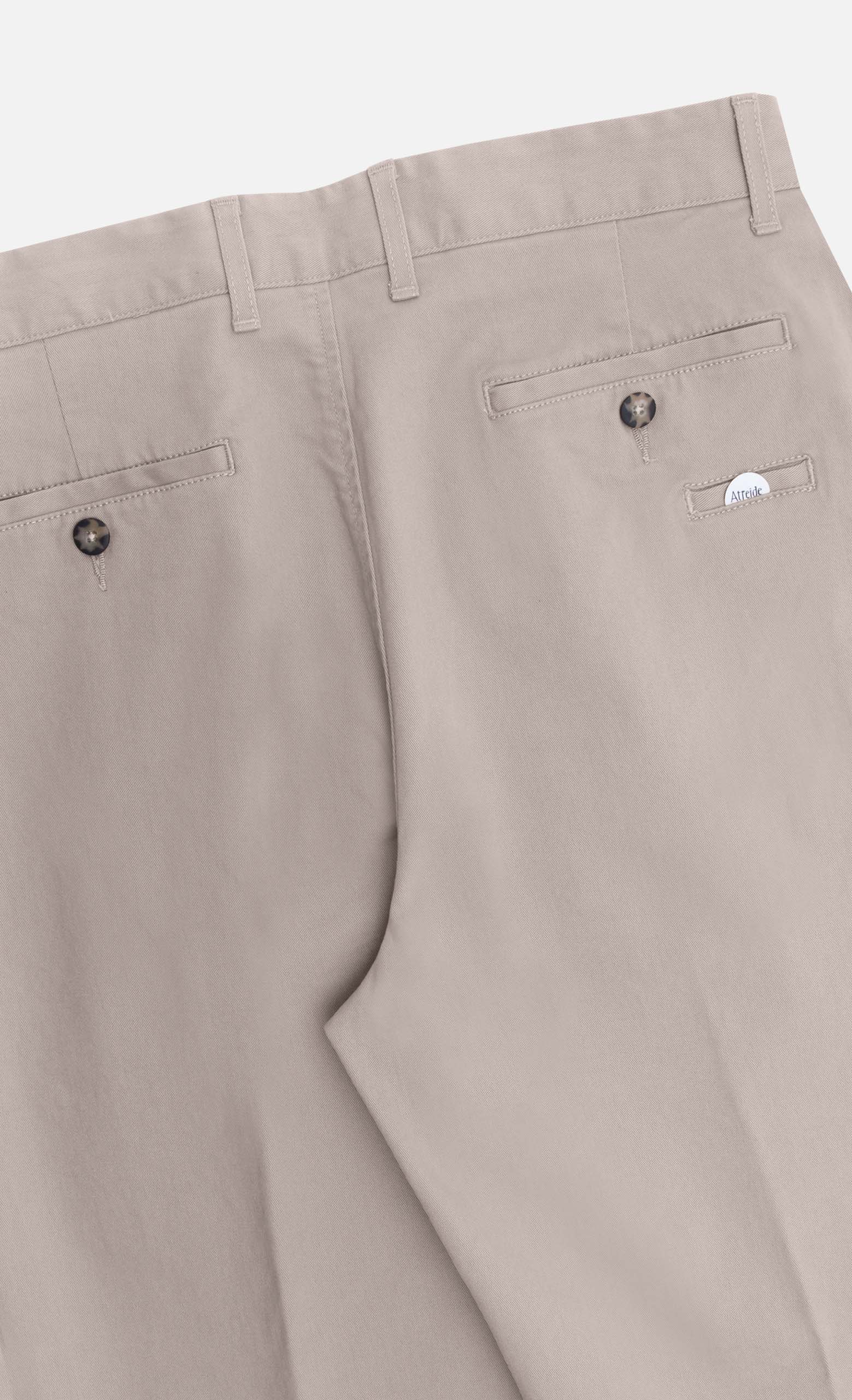 Tasche anteriori e dettaglio di tasche posteriori a doppio filetto con bottone.
