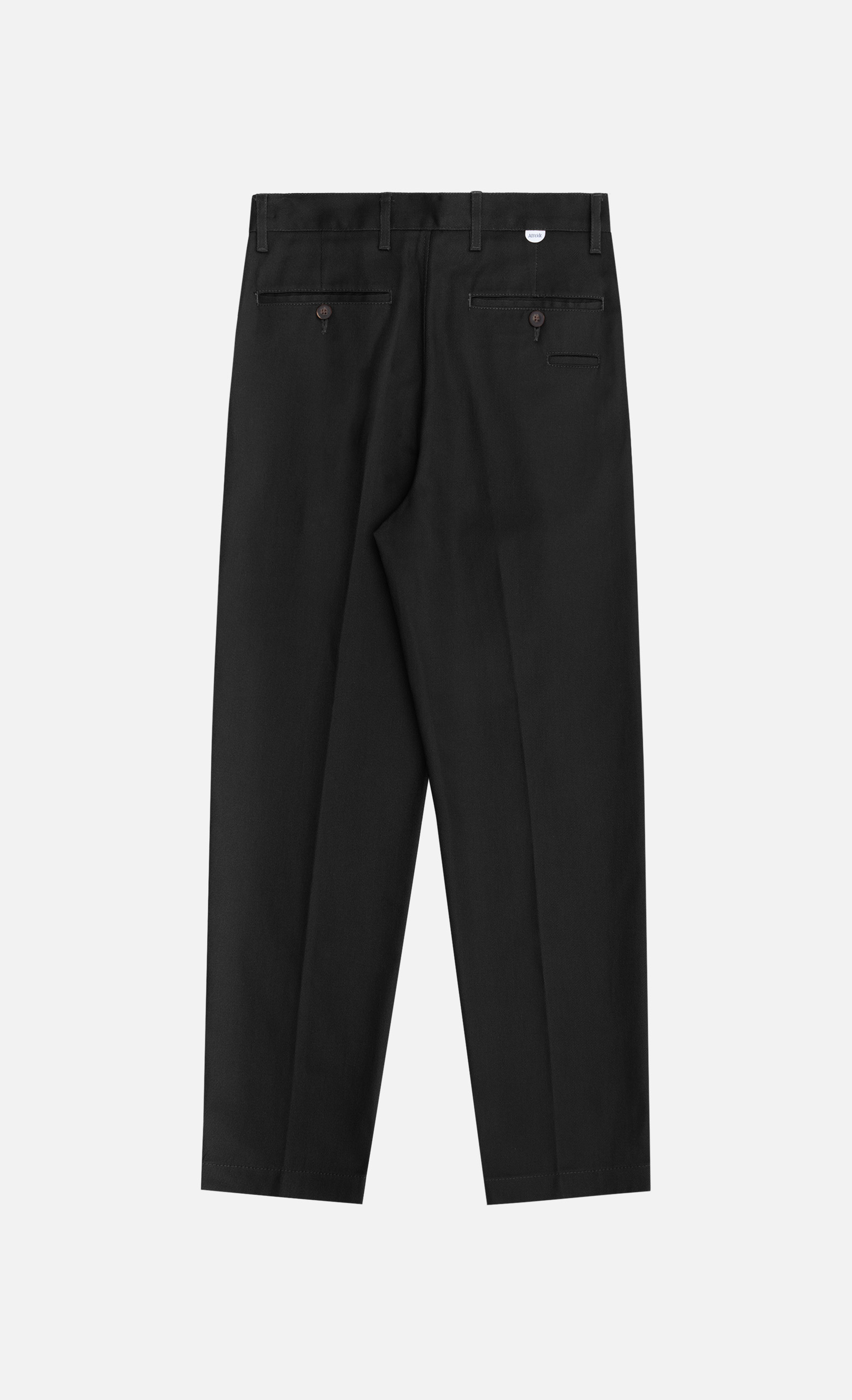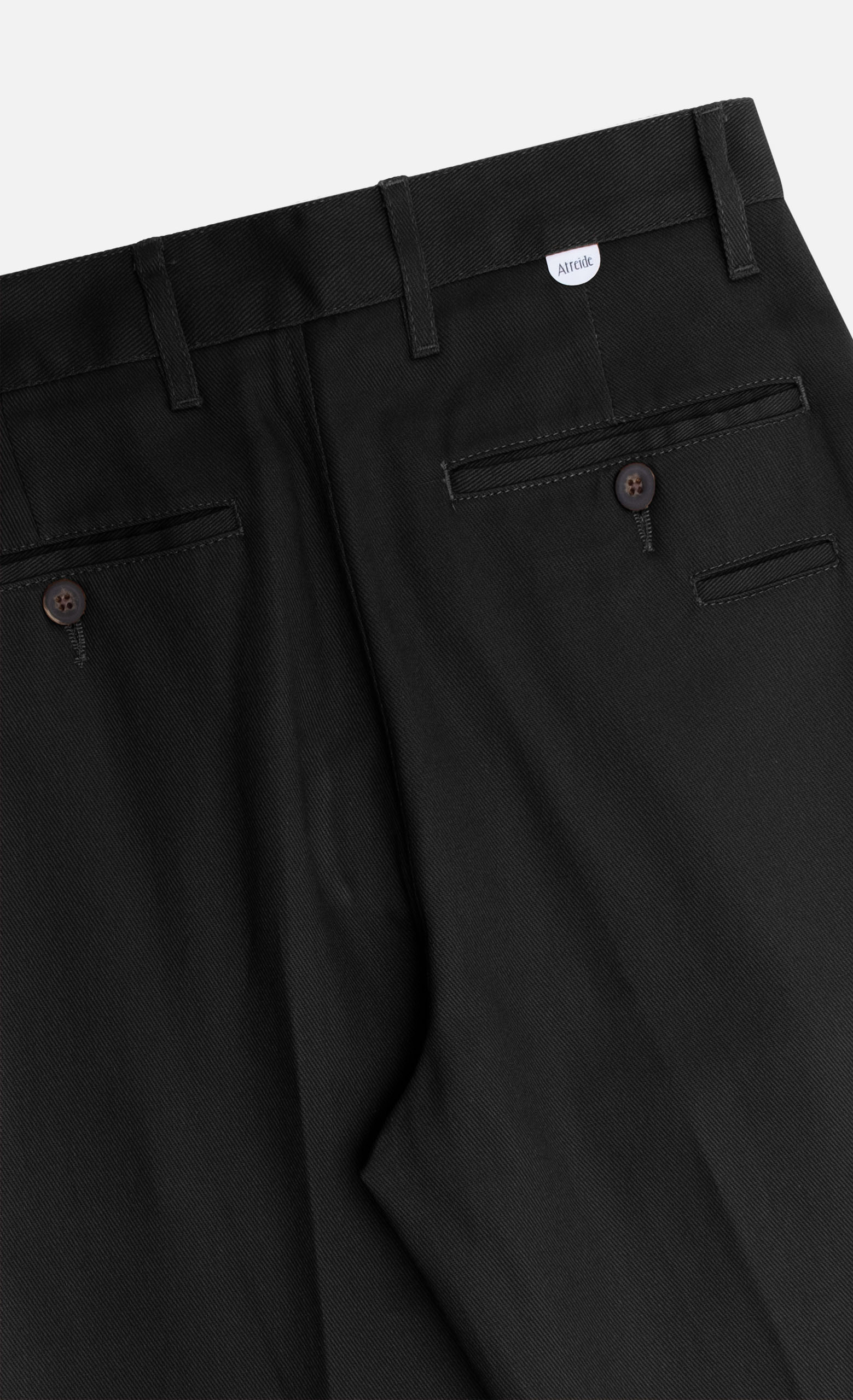 Tasche anteriori e dettaglio di tasche posteriori a doppio filetto con bottone.