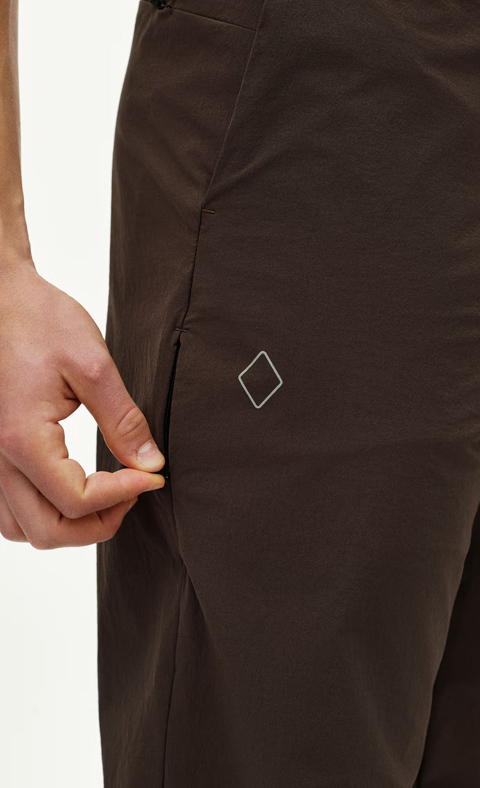 Una piccola tasca laterale con zip integrata nella cucitura e una tasca posteriore con zip
